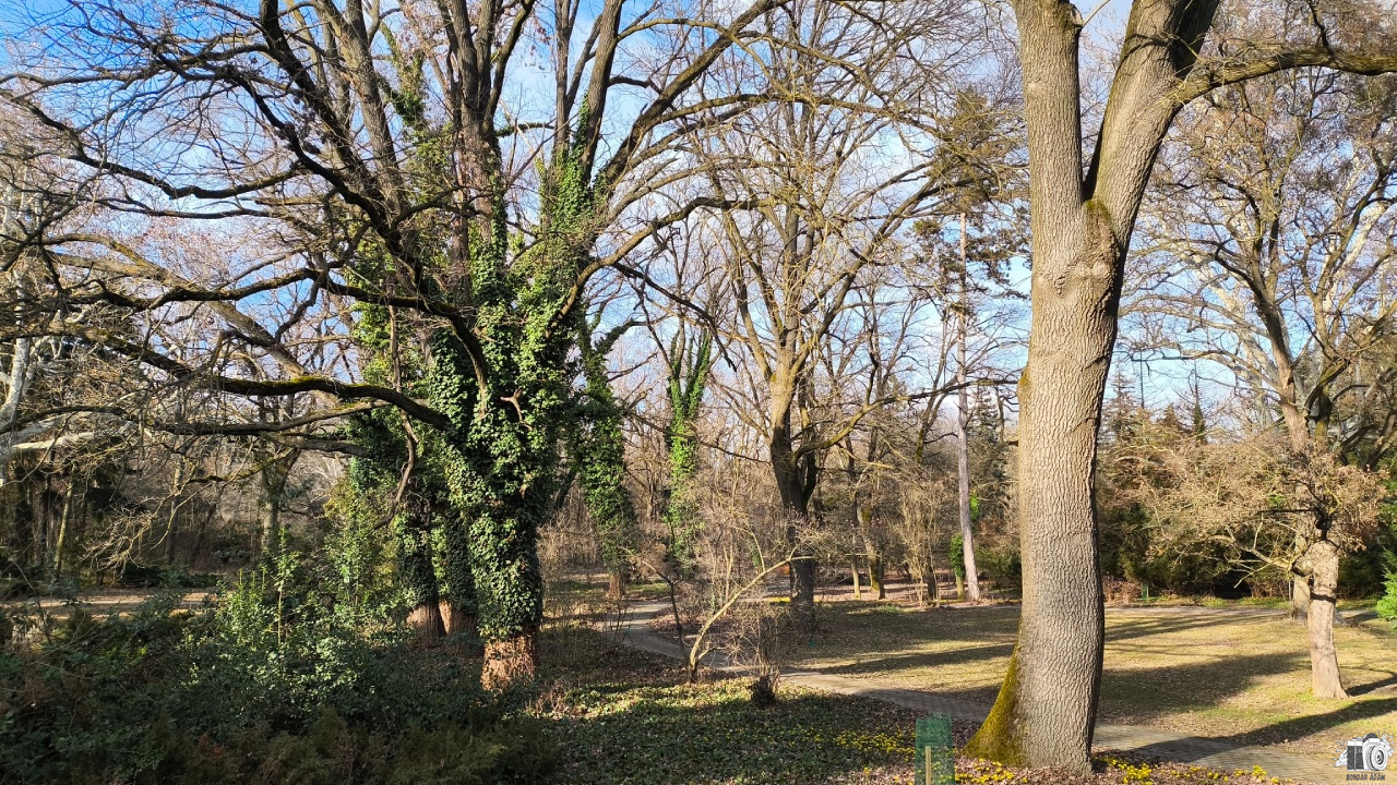Ahogy tovább sétáltam, hatalmas, idős fák alatt haladtam el. Vannak itt sudár tölgyek, elegáns kőrisek, különleges juharfajok. Tavasszal és nyáron bizonyára egészen más arcát mutatja a kert, de a tél végi időszaknak is megvan a maga varázsa: a csupasz ágak rajzolata, a fák kérgének textúrája, a csend. A cserjeszintben ilyenkor már rügyeznek a somok és mogyorók, néhol barkák lengedeznek a hűvös szélben. A talaj közelében nemcsak téltemető, hanem hóvirág és krókusz is feltűnik, jelezve, hogy a természet már készülődik.